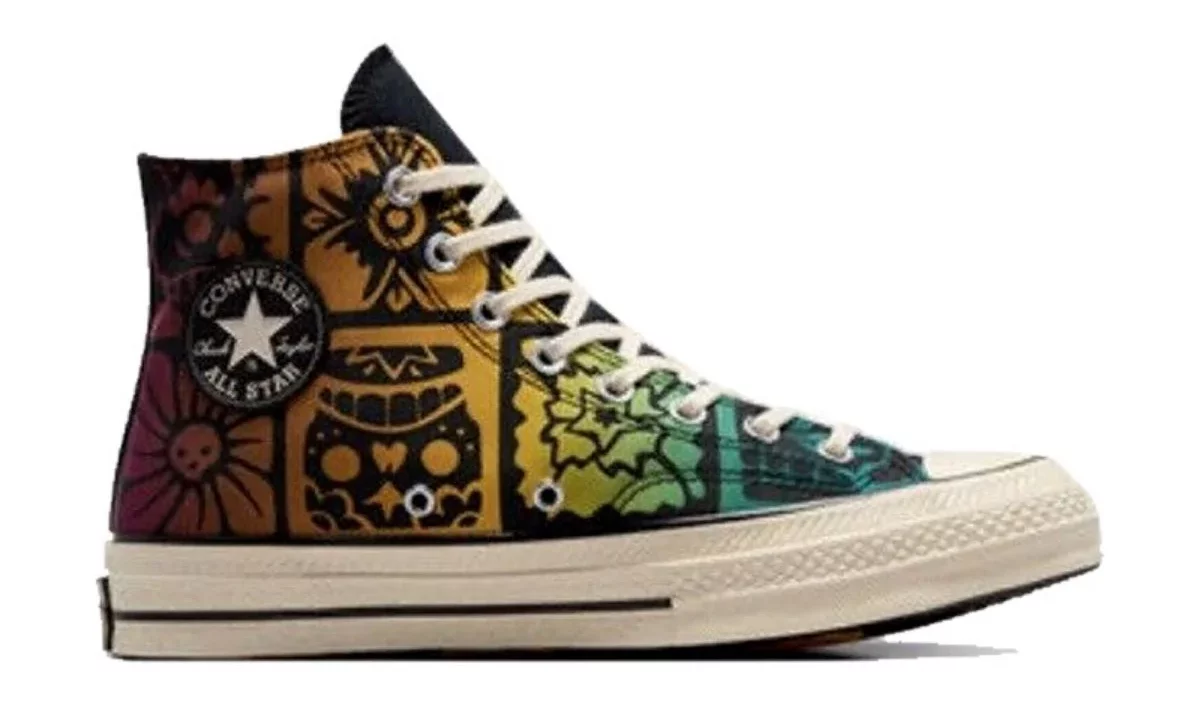 - Chuck Taylor All Star Lift Platform Día de Muertos: Este modelo en color hueso presenta estampados tono sobre tono que simbolizan la sobriedad y la memoria. Al unir las suelas de ambos tenis, aparece el rostro de una calaverita de azúcar, un símbolo icónico del Día de Muertos.