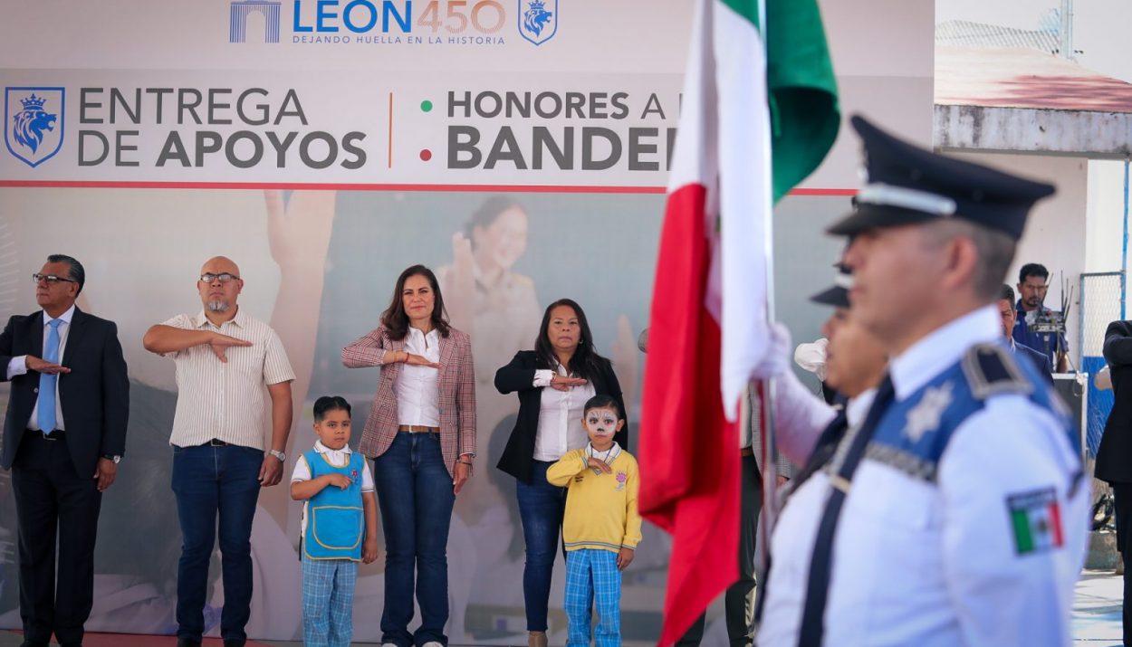 Durante los Honores a la Bandera realizados en la institución educativa, la presidenta municipal destacó que estas acciones forman parte del compromiso de su administración para impulsar mejores condiciones de aprendizaje en las escuelas de León.