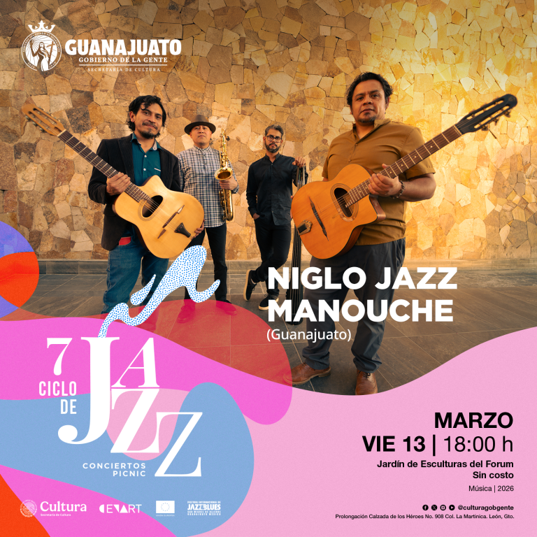 El ciclo iniciará el viernes 13 de marzo a las 18:00 horas con la presentación de NIGLO Jazz Manouche, agrupación originaria de Guanajuato inspirada en la tradición del swing gitano asociada al legado del guitarrista Django Reinhardt.