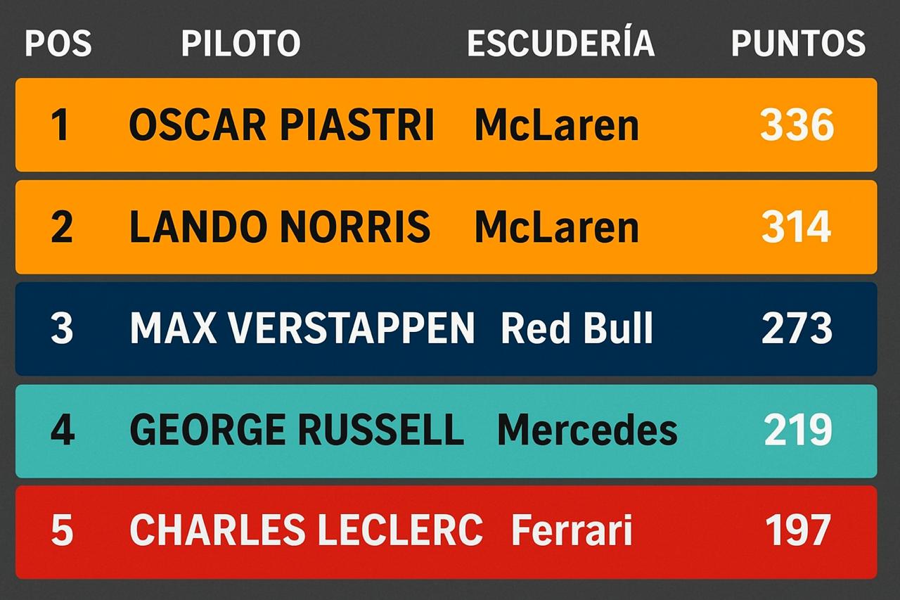 Piastri conserva el liderato, pero Norris continúa recortando distancia y promete llevar la definición hasta las últimas fechas. Verstappen, aunque más alejado, sigue siendo un contendiente peligroso.