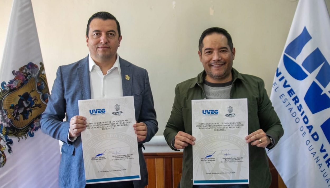 Romita, Guanajuato. Con el objetivo de ampliar las oportunidades educativas en el municipio, la Universidad Virtual del Estado de Guanajuato (UVEG) y el Municipio de Romita firmaron un Convenio de Colaboración que prioriza el acceso a becas, el impulso a mujeres y apoyos académicos dirigidos a integrantes de seguridad pública y sus familias.