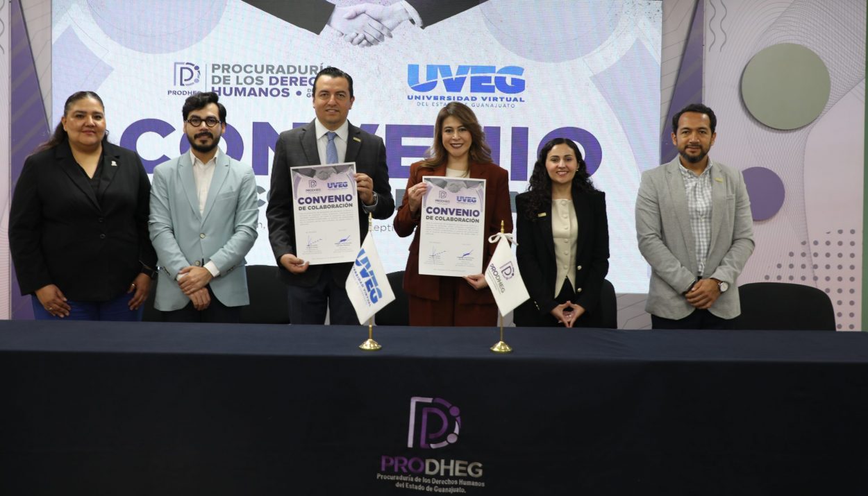 León, Gto. La Universidad Virtual del Estado de Guanajuato (UVEG) y la Procuraduría de los Derechos Humanos del Estado de Guanajuato (PRODHEG) firmaron un convenio de colaboración que busca llevar educación y capacitación en derechos humanos a todos los rincones del estado, con un enfoque incluyente y accesible.
